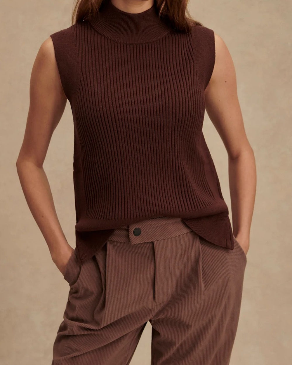 This top features a chic turtleneck design and ribbed knit pattern, crafted from soft and breathable fabric. The sleeveless cut and relaxed fit offer both comfort and style, making it perfect for layering or wearing alone in transitional seasons. Available in rich brown and elegant taupe, it combines timeless sophistication with modern versatility. The side zipper detail adds a touch of uniqueness, ensuring you stand out with a polished and refined look.